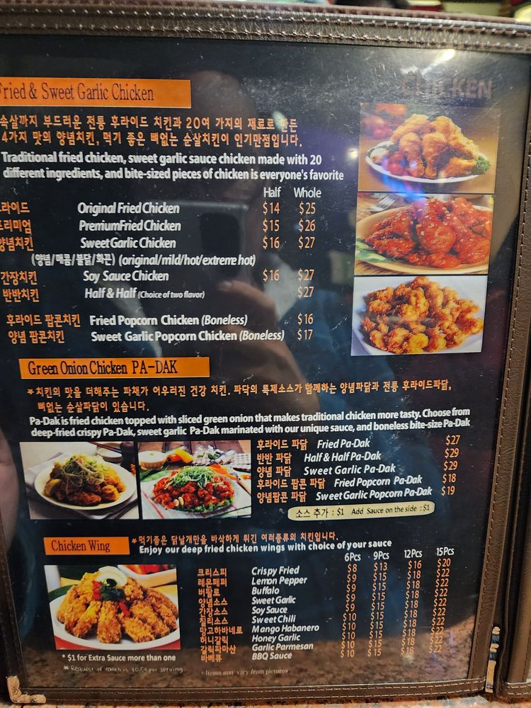 The menu also features tempting combo deals, such as the Happy Combo, which pairs a whole chicken with a medium sweet potato pizza and a refreshing drink. The ambiance is inviting, perfect for groups or family outings, complete with outdoor seating and free Wi-Fi. Ideal for lunch, dinner, or late-night cravings, Flying Chicken Pa-Dak is more than a meal; it's a vibrant experience. Whether you're here for a casual dine-in or convenient takeout, this establishment welcomes all food lovers!