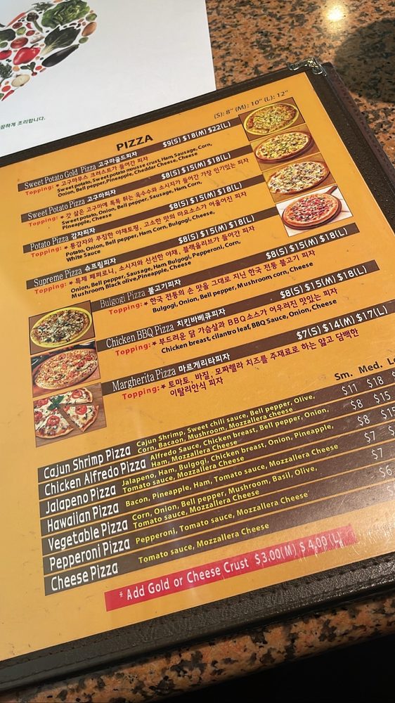 Potato, onion, bell pepper, ham, corn, bulgogi, cheese, and white sauce.